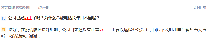 此外,一些投资者抱怨称,董秘的电话号码“多年来一直无法使用”。对此,紫光国威解释说,在疫情防控的特殊时期,公司目前还没有恢复正常工作。主要是远程办公。回复不及时,电话暂时无人接听。请理解。