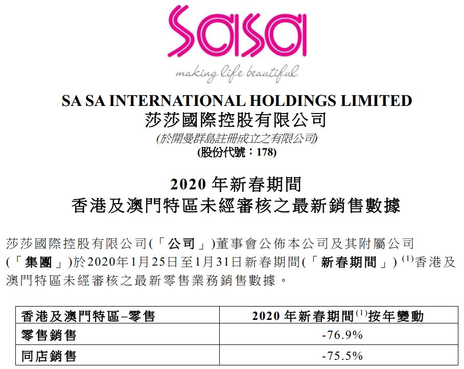 2020年2月6日,莎莎国际披露了2020年春节期间(第一个月的第一天到第一个月的第七天)的零售数据。2020年1月25日至1月31日期间,香港和澳门未经审计的零售销售额同比下降76.9%,而同店销售额同比下降75.5%。