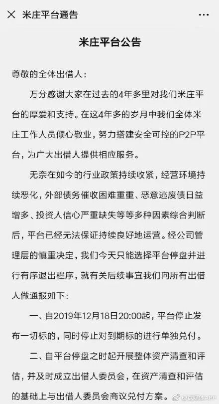 公告显示,从2019年12月18日20点开始,米庄平台将停止发布所有目标,并将分别停止支付到期目标。同时,从停牌平台开始,将进行全面的资产清查和评估,并及时成立贷款委员会,根据资产清查和评估情况与贷款委员会讨论支付计划。